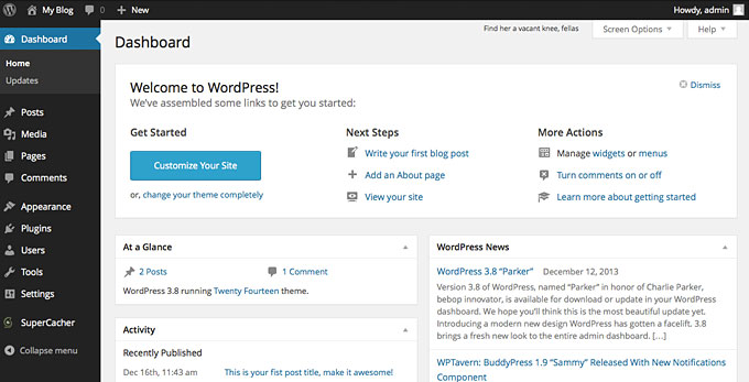 First we’ll take a look at the dashboard home screen. After you first log in, you’ll see a top welcome box from WordPress with some quick links to help you get started.